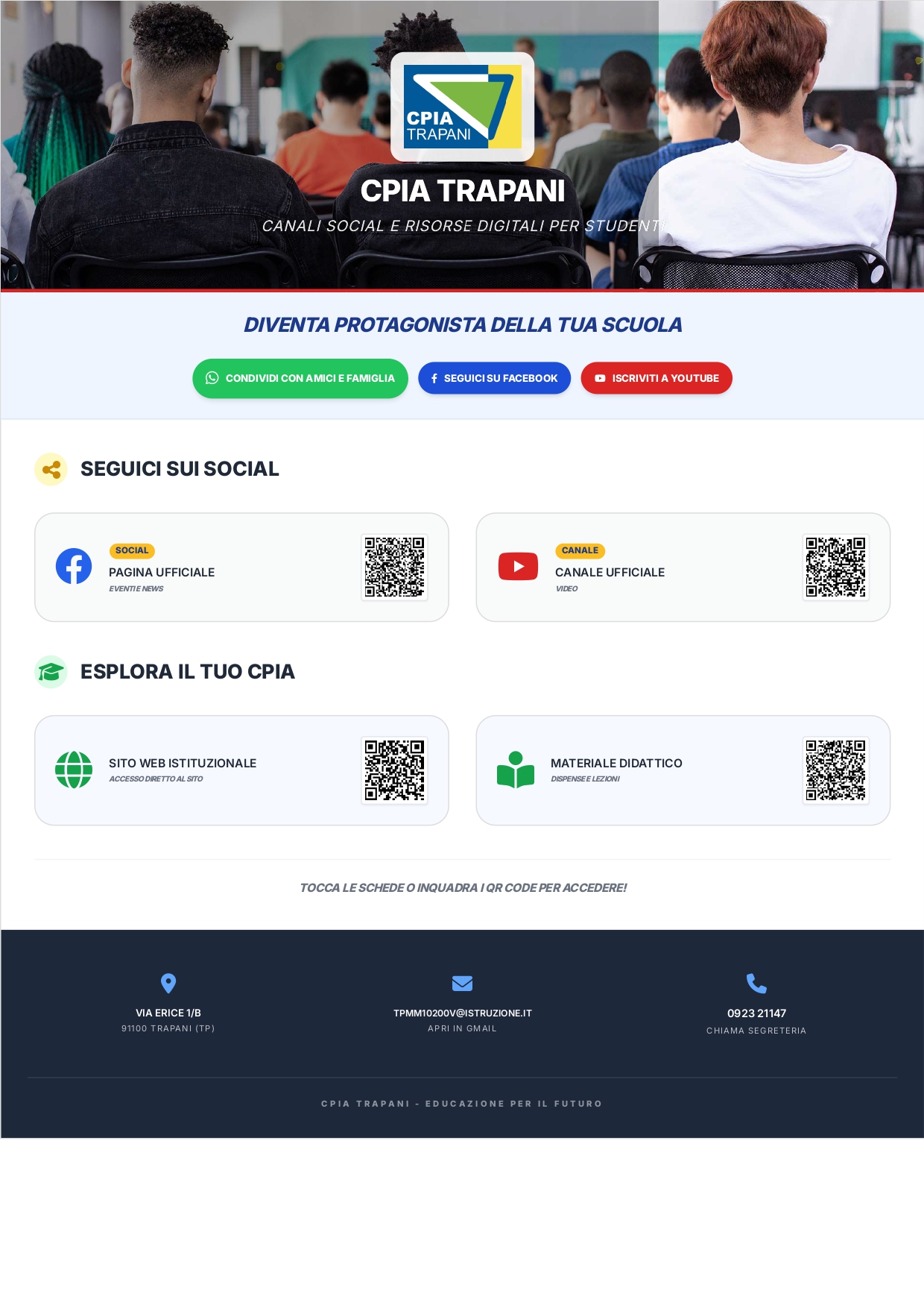 Invitiamo caldamente tutti gli studenti, le loro famiglie, i futuri iscritti e l’intera cittadinanza a seguire i nostri profili ufficiali per non perdere nessuna novità. Il CPIA Trapani si impegna a utilizzare questi strumenti per promuovere non solo le proprie attività, ma anche i valori dell’istruzione permanente e dell’inclusione, costruendo una comunità online dinamica e partecipativa.